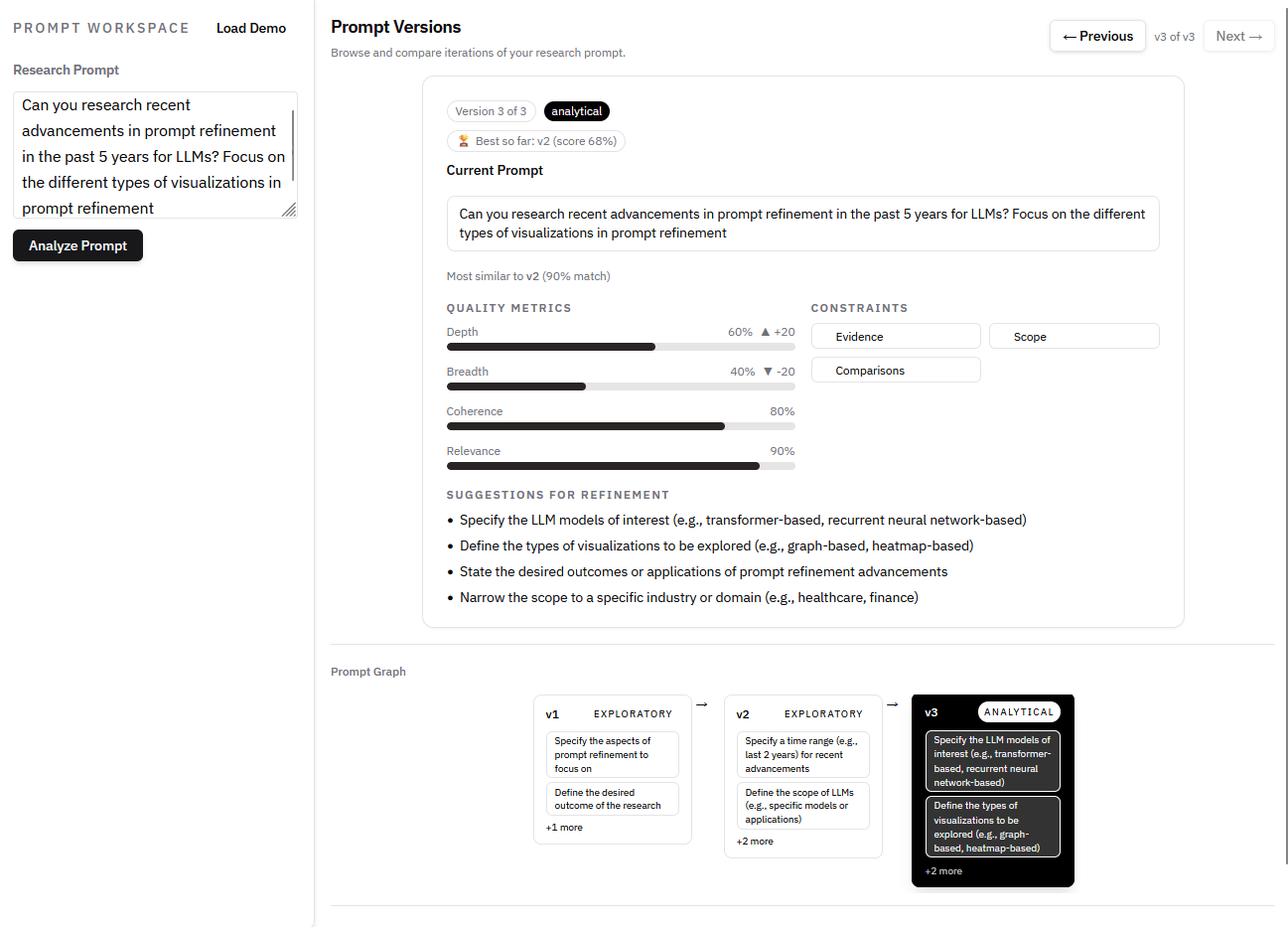 The final interface presents a linear prompt version history, quality metrics with deltas between versions, constraint badges, and ranked refinement suggestions. These elements allow users to see how edits affect predicted research outcomes before execution.